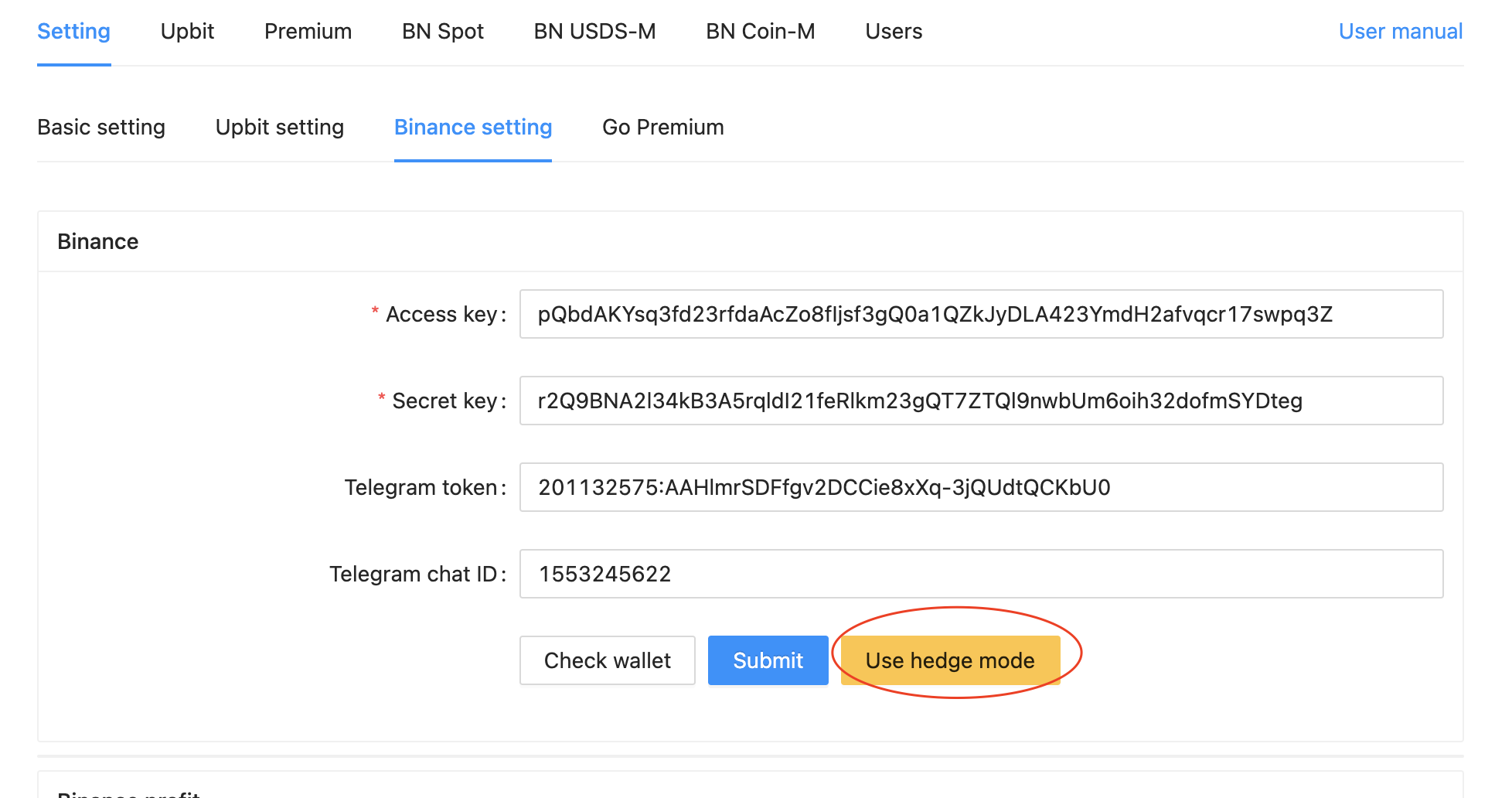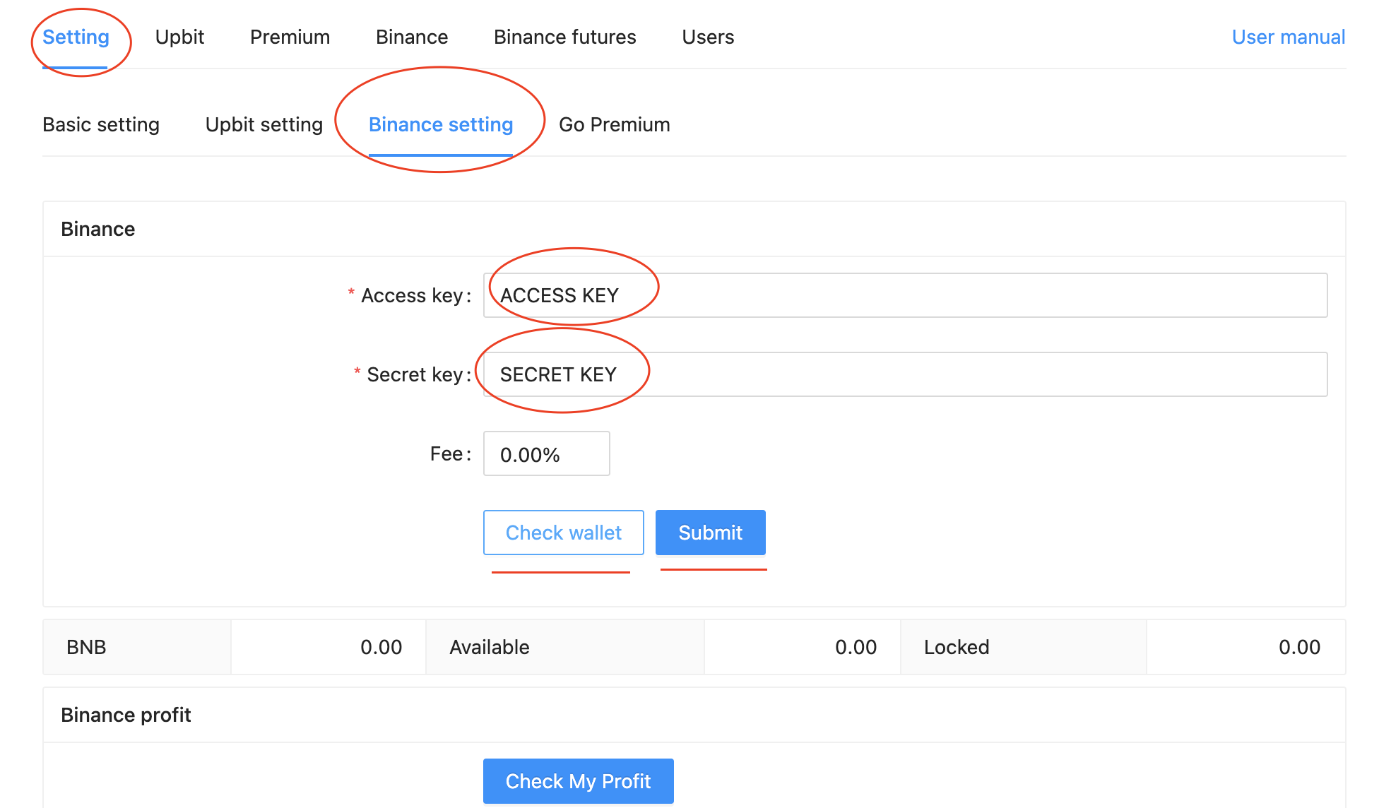 바이낸스에서 발급받은 API Key, Secret Key 를 각각 입력한다.