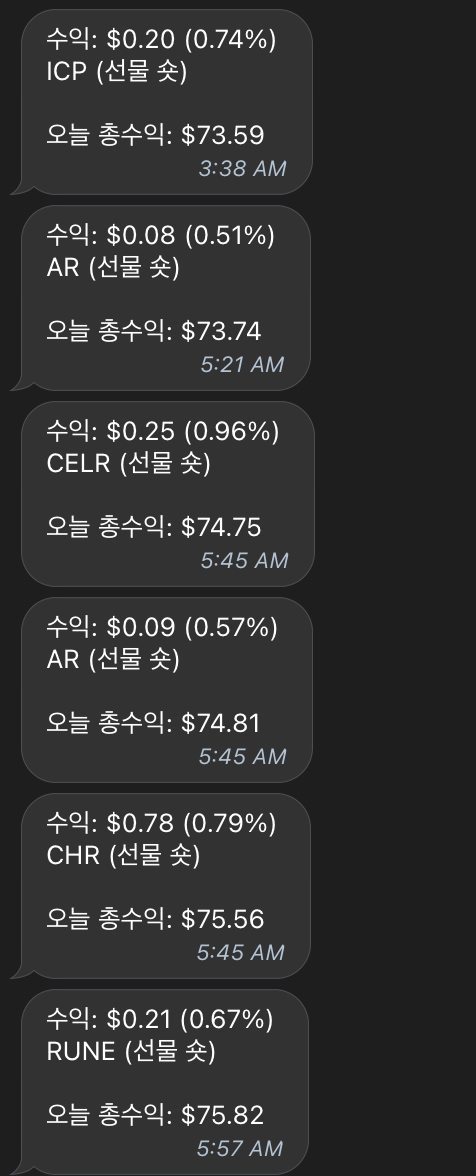 이후 자동매매가 돌아가면서 상황이 발생될 때마다 텔레그램으로 알림을 아래와 같이 보내줍니다.