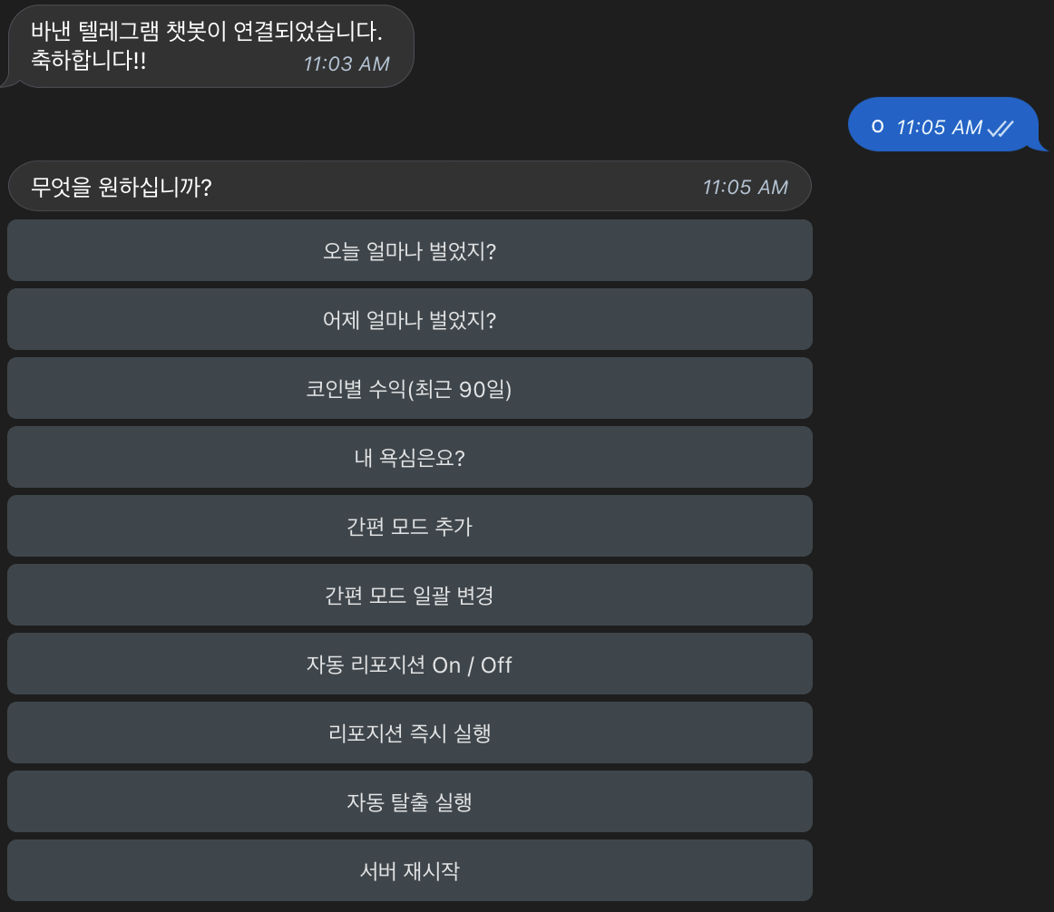 바이낸스 챗봇과 업비트 챗봇을 각각 만들어서 사용해야 한다.