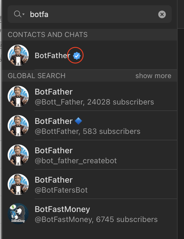 텔레그램에서 BotFather 를 검색해서 친구 추가한다.