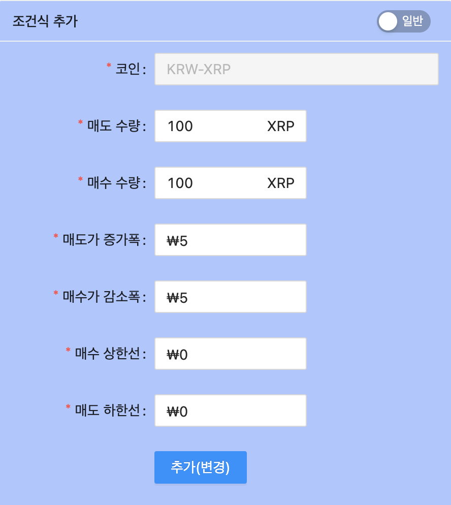 - 주문당 코인수 에 조건식에 입력한 수량 100을 입력