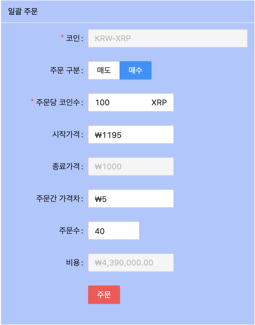 - 주문수 에 40(본인 시드에 맞게) 입력